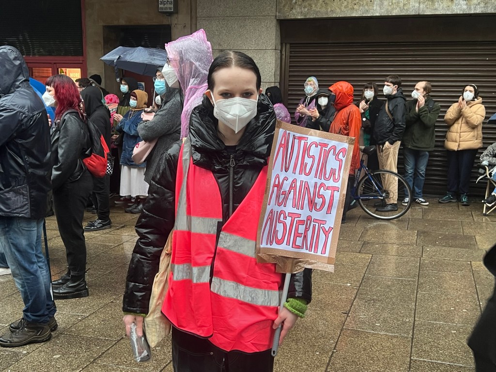 The Crips Against Cuts protestors gathered outside St John’s Centre, carrying banners with messages such as: “Fund the welfare, not the warfare”, “Autistics against Austerity” and “Welfare Cuts Kill!”.